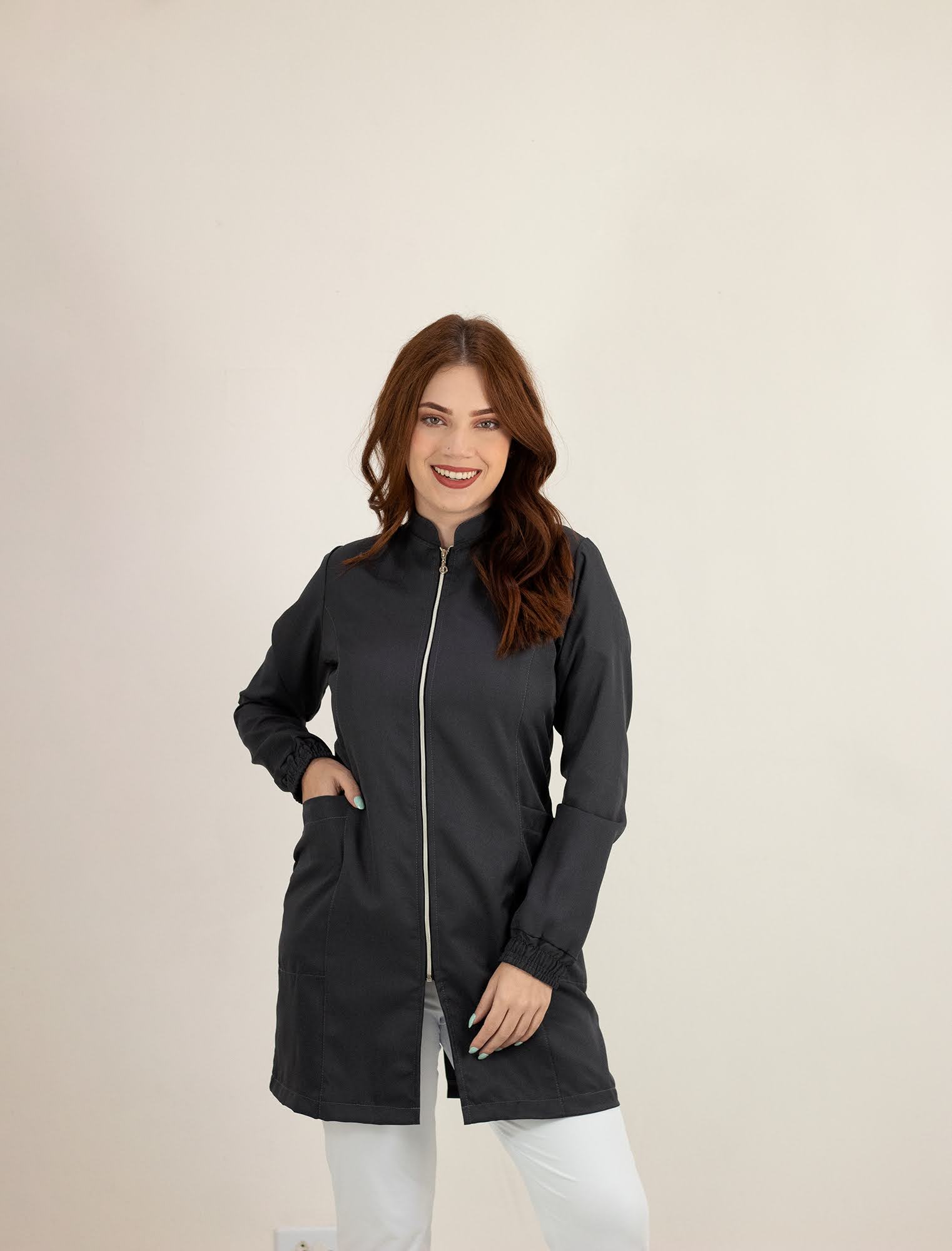 O jaleco modelo Genova é feito no tecido Gabardine na cor chumbo, acinturado com detalhes nos bolsos e na gola modelo padre em tricoline, mangas compridas e fechamento frontal com botões.